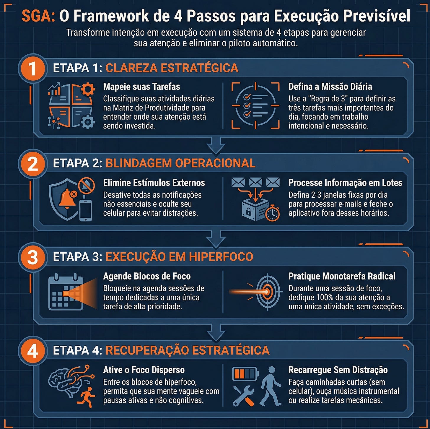 Baseado nos princípios do livro, desenvolvi o Sistema de Gestão Atencional (SGA). Um protocolo em quatro etapas para transformar intenção em execução previsível.