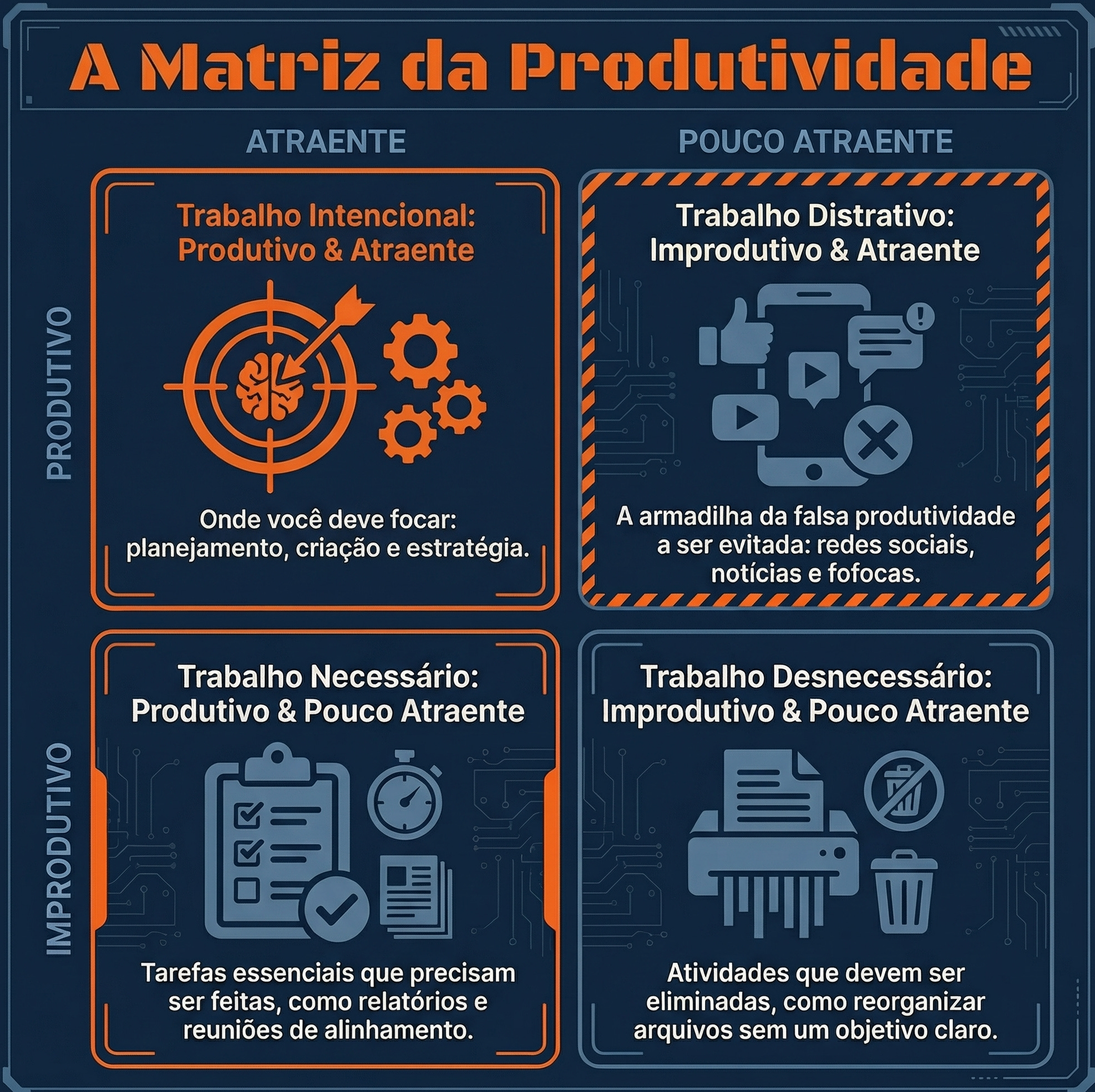 Para lidar com relatórios chatos (”Trabalho Necessário”), ele usa a tática de Hiperfoco curto. Executa a tarefa chata logo no primeiro bloco do dia, livrando-se dela rapidamente para preservar sua energia mental para o trabalho estratégico no restante do expediente.