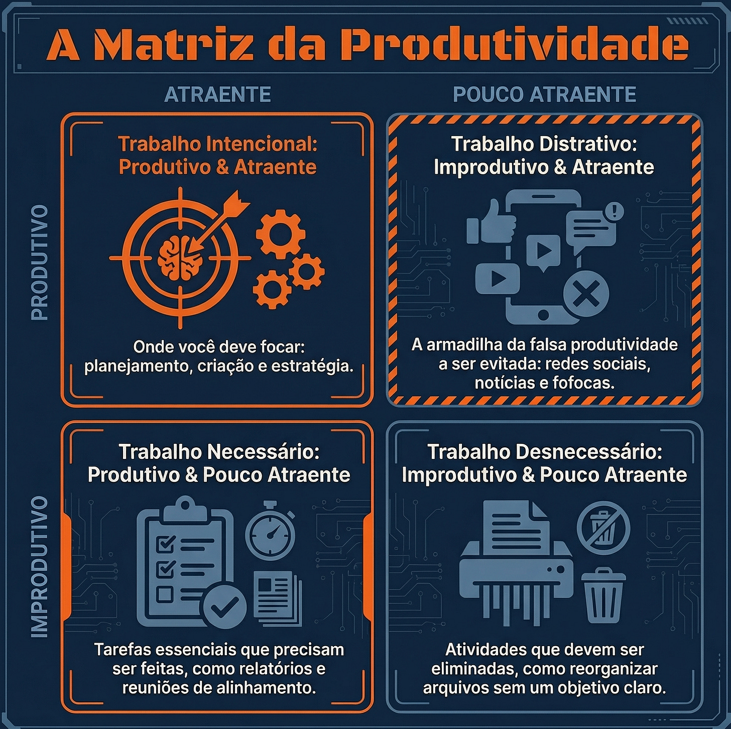 Utilize a Matriz da Produtividade de Chris Bailey para classificar suas atividades diárias. Seja brutalmente honesto: