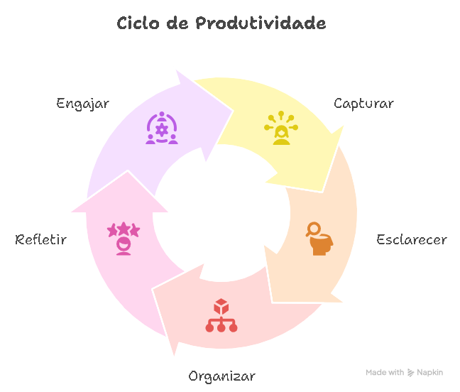 O método GTD é estruturado em cinco passos sequenciais que permitem gerenciar o fluxo de trabalho de forma horizontal, garantindo que nenhum compromisso seja esquecido e que a mente permaneça livre para focar na tarefa em questão.