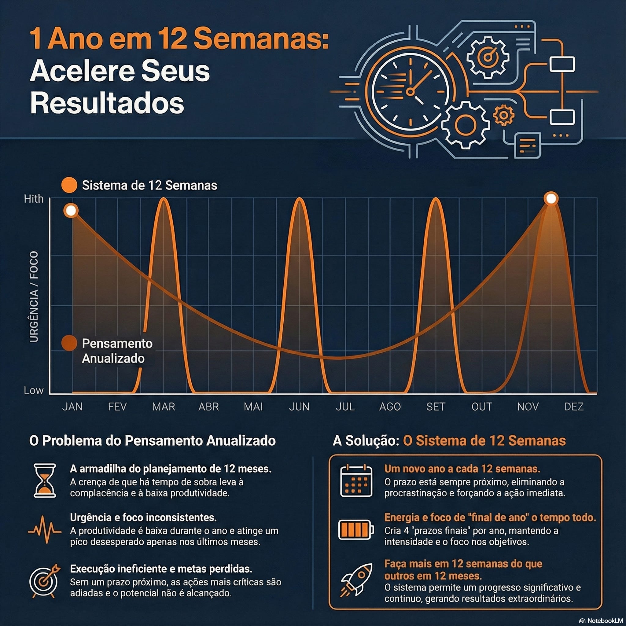 O livro propõe uma solução radical: replicar essa clareza e urgência não uma vez por ano, mas a cada 12 semanas.